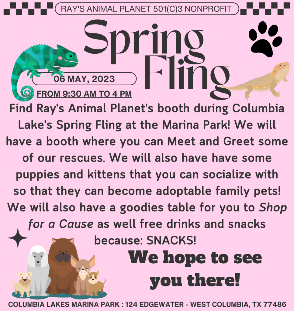 We’re busy scrambling and getting ready for this Saturday: Columbia Lake’s Spring Fling ! We do hope you can stop by and say hello! We will have our usual table of goodies to shop at, a table of free snacks and a table with our rescues for you to Meet and Greet. It’ll be fun!