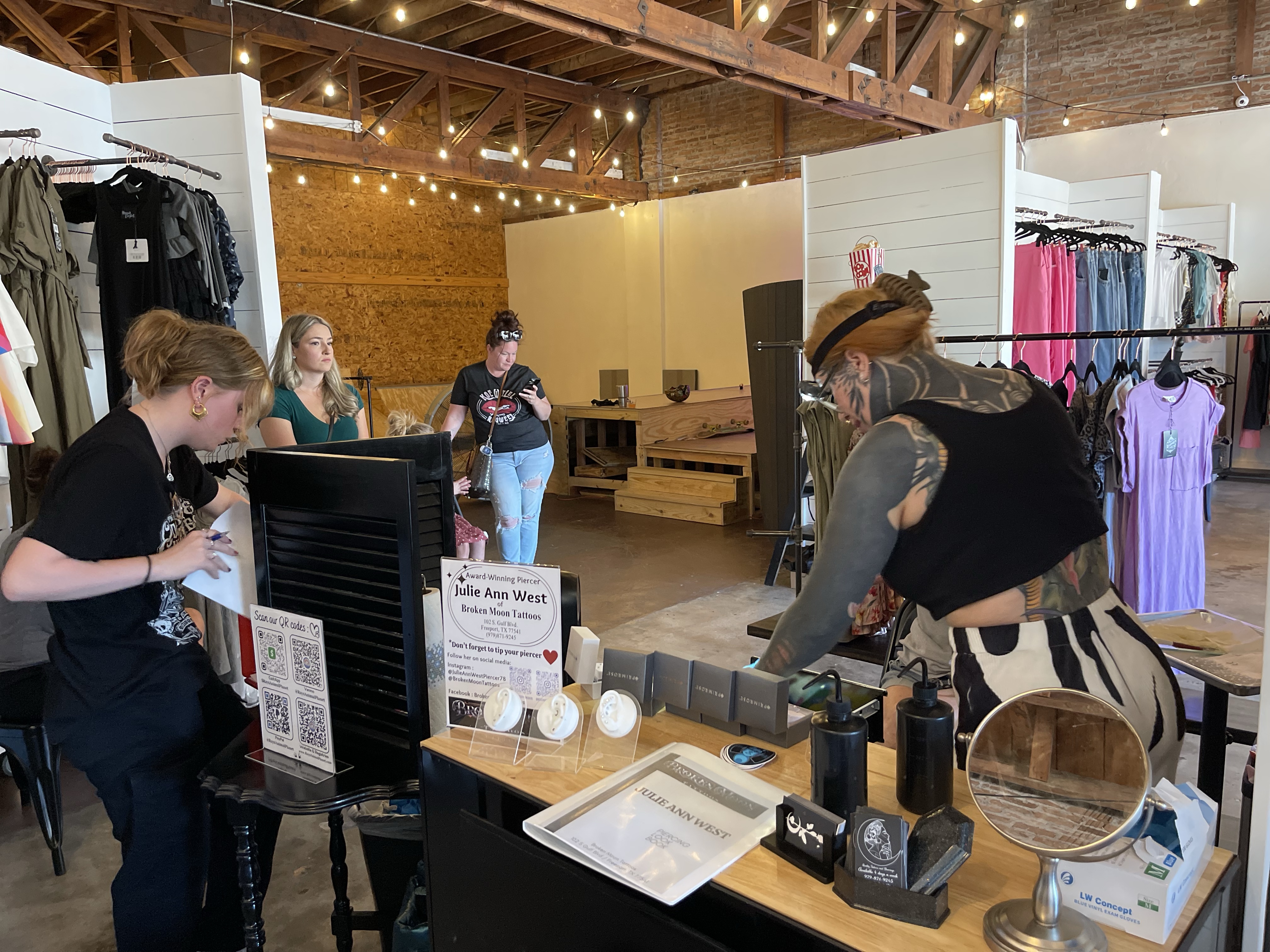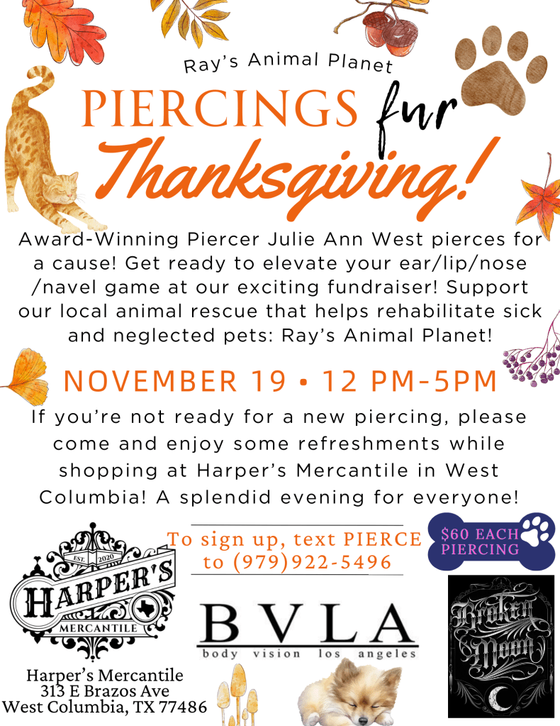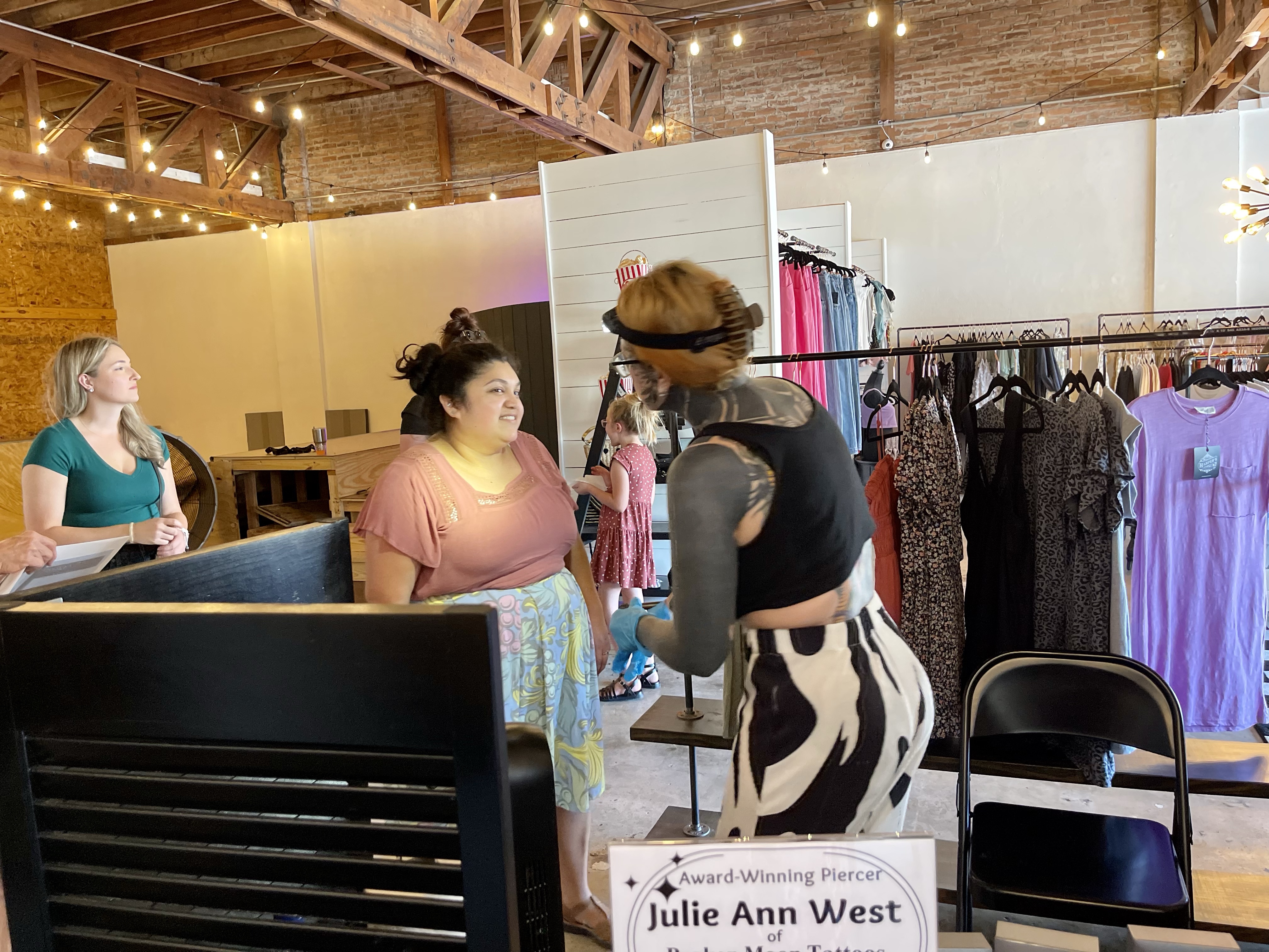 We planned a piercing party fundraiser at the funnest shop, Harper’s Mercantile, with Award-Winning piercer Julie Ann West of Broken Moon tattoos and it was EXTRAORDINARY!! While we had expected a low number of supporters, our community really came out on the day of the fundraiser- we sure had a blast!