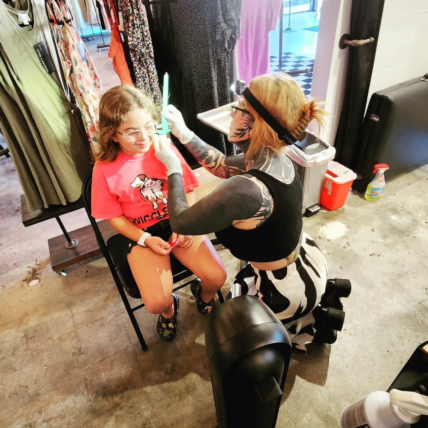 She pierced young girls coming of age, they were so excited to get their first piercings ever and Julie is, of course, loved by all! Julie Ann pierces and tattooes with her husband at their shop : Broken Moon Tattoos in Freeport, TX. They are the go-to shop for our community, as their standards for sanitation and attention to detail are over the top! You feel welcomed from the moment you walk in and they make sure that you get exactly what you want in your piercing or tattoo. It was an absolute blessing to partner up with them, we cannot say enough kind things about them!